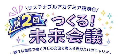 2026年3月17日(火)に、現役大学生を対象としたキャリアイベント『第2回 つくる!未来会議〜様々な業界で働く⽅との交流で考える自分だけのキャリア〜』を開催いたします。本イベントはさまざまな業界の方との交流を通じて、学生が自らのキャリアや社会課題について主体的に考えるきっかけを提供することを目的としています。また、当社が提供する学生向けキャリア講座『サステナブルアカデミア』の説明会およびプレ体験を兼ねたイベントでもあり、受講希望者向け説明会もイベント内で実施いたします。